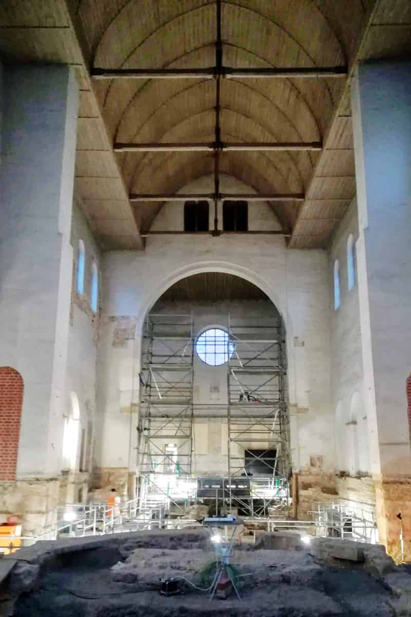 Im Mittelschiff wurden gemäß alter Überlieferungen Öffnungen zu den Seitenschiffen geschaffen, wodurch das über tausend Jahre alte Mauerwerk erhalten werden konnte, während zahlreiche Gründungsverstärkungen aufgrund der Absenkung des Fußbodens im Inneren der Kirche durchgeführt werden mussten.