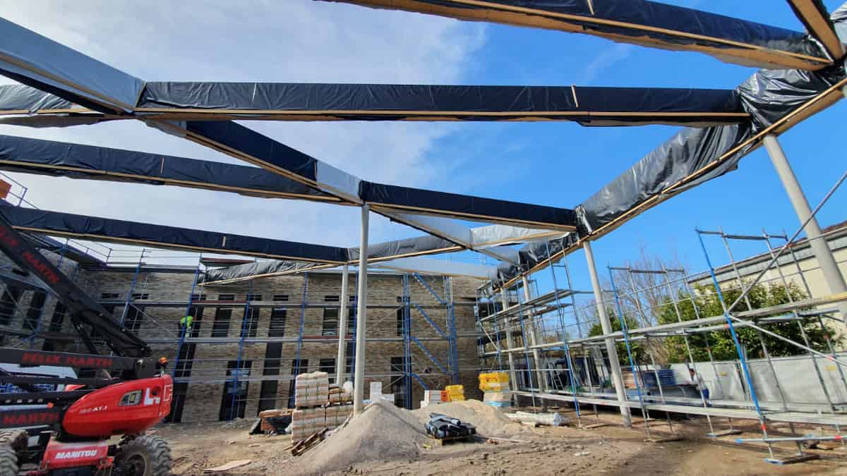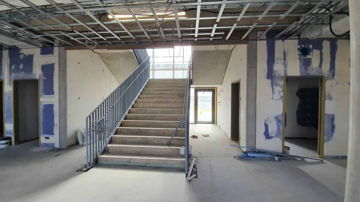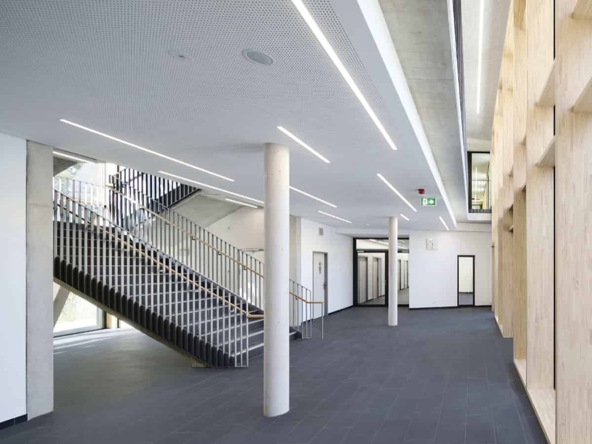Der Neubau ist wieder ein zweigeschossiges massives Gebäude in Form eines U. Die Klassenräume sind in den beiden Schenkeln untergebracht. Der Innenhof erhält eine Holzkonstruktion mit Verschattung. Ein Großteil der Innenbereiche wird über eine zentrale Lüftung mit Wärmerückgewinnung belüftet.