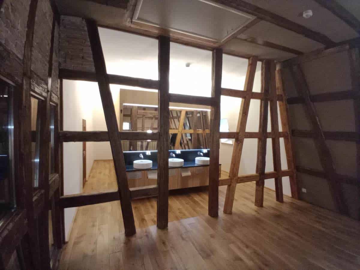 Im Gewölbekeller wurde durch einen neuen, erhöhten Bodenaufbau die bestehende Grundwasserproblematik verbessert, so dass dieser als Lagerraum genutzt werden kann. Die Dachkonstruktion war aufgrund pflanzlicher und tierischer Holzschädlinge stark geschädigt und wurde umfangreich saniert.
