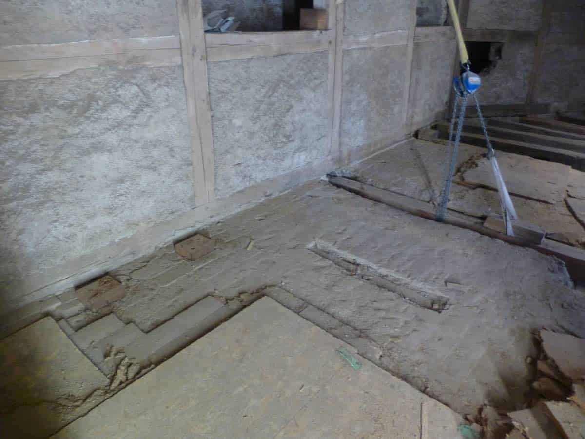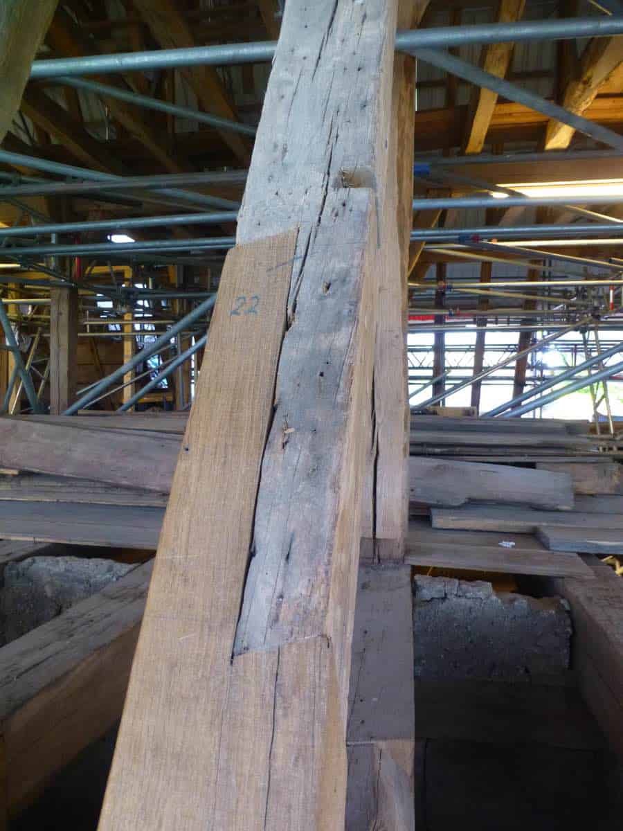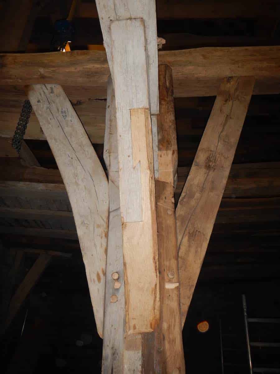 Des Weiteren haben sich die Innenfundamente des Gebäudes abgesenkt. Diese entstanden vermutlich aus der Kombination einer sehr hohen Belastung und einem ungenügend verdichteten Boden. Da alle Stützen und Kopfbänder mit Holznägeln zugfest miteinander verbunden sind, schwebten viele der Stützen im ungenutzten Zustand über dem Boden.