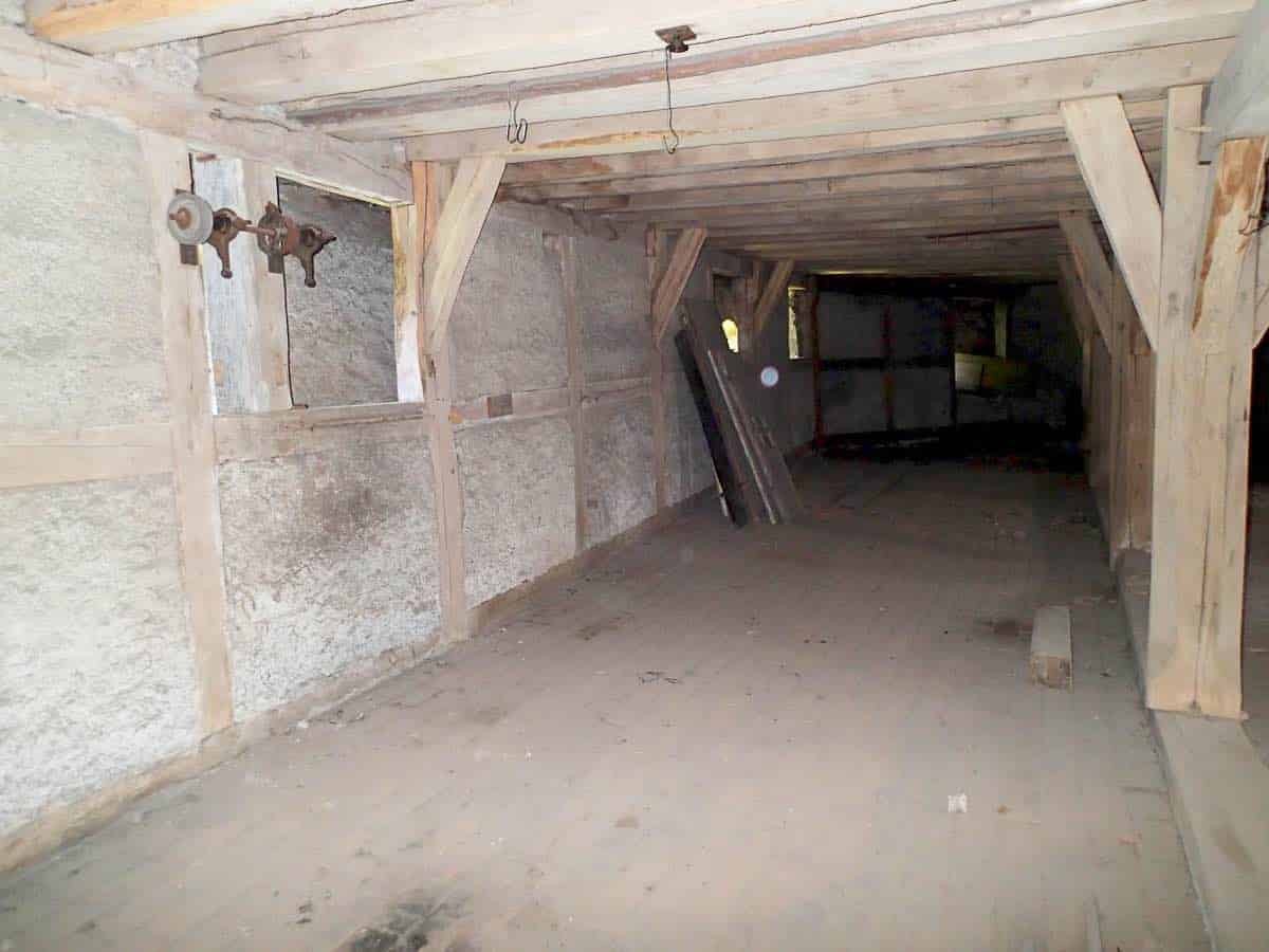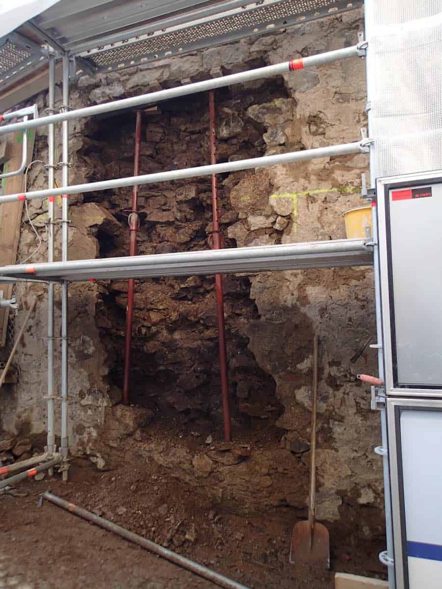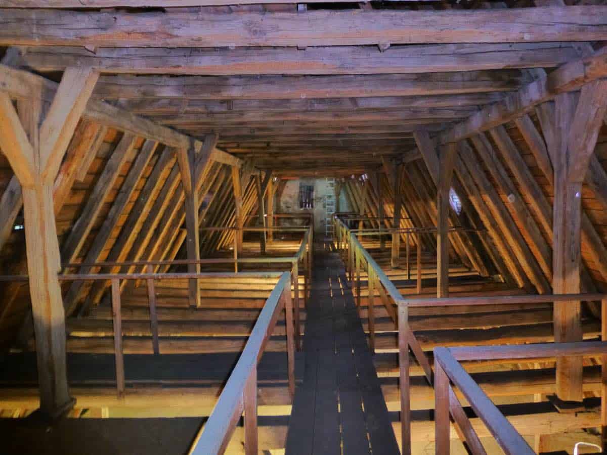 Des Weiteren haben sich die Innenfundamente des Gebäudes abgesenkt. Diese entstanden vermutlich aus der Kombination einer sehr hohen Belastung und einem ungenügend verdichteten Boden. Da alle Stützen und Kopfbänder mit Holznägeln zugfest miteinander verbunden sind, schwebten viele der Stützen im ungenutzten Zustand über dem Boden.