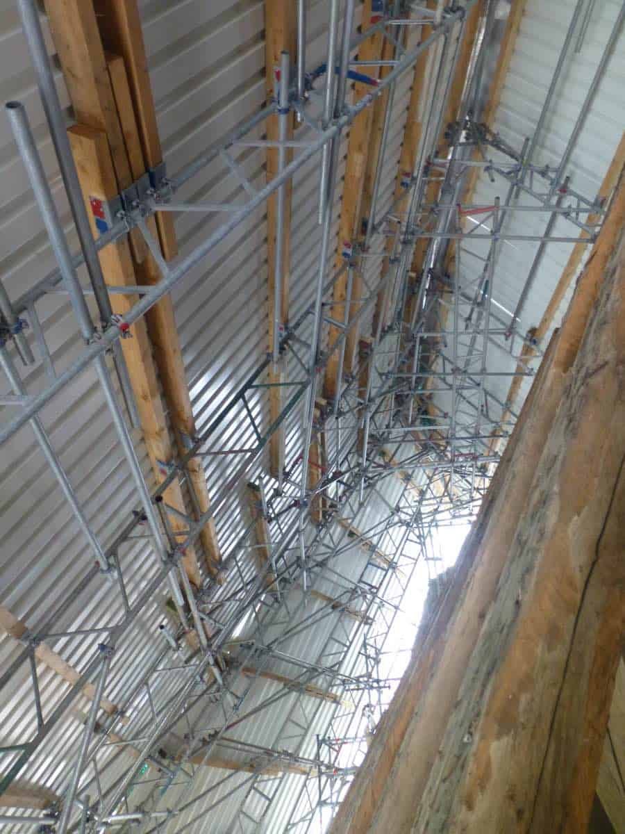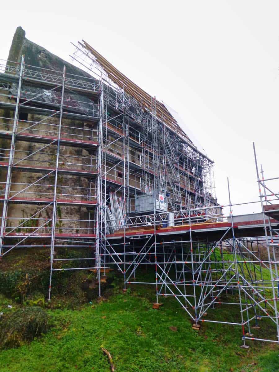 Aufgrund der exponierten Lage auf einem Bergrücken wurde der Marstall mit einem Gerüst-Notdach überbaut, um die Sanierungsarbeiten frei von Witterungseinflüssen durchführen zu können.