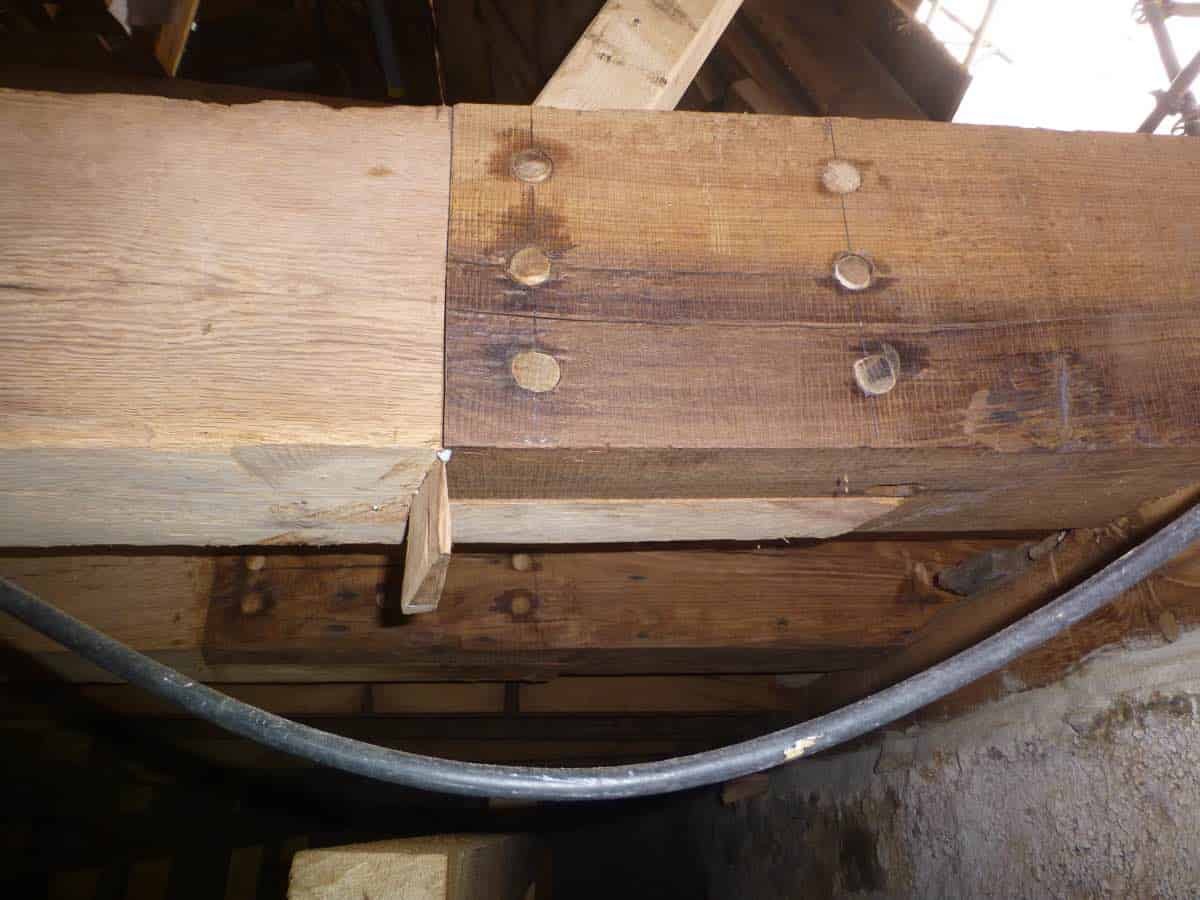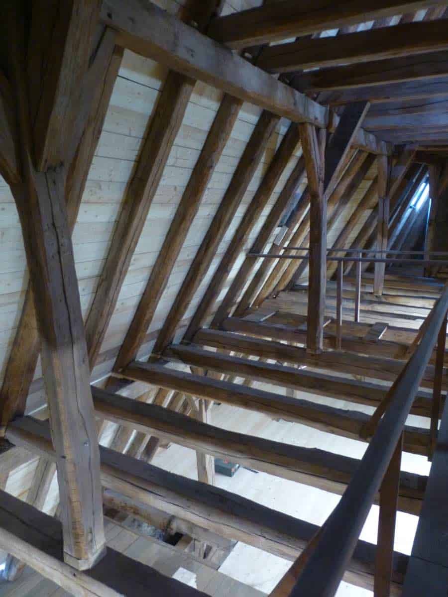 Bei der denkmalgerechten Sanierung wurden die geschädigten Holzbauteile gesundgeschnitten und mit stehenden Blättern und Holznägeln wiederhergestellt. Es wurde auf einen reduzierten Einsatz von metallischen Verbindungsmitteln wert gelegt.