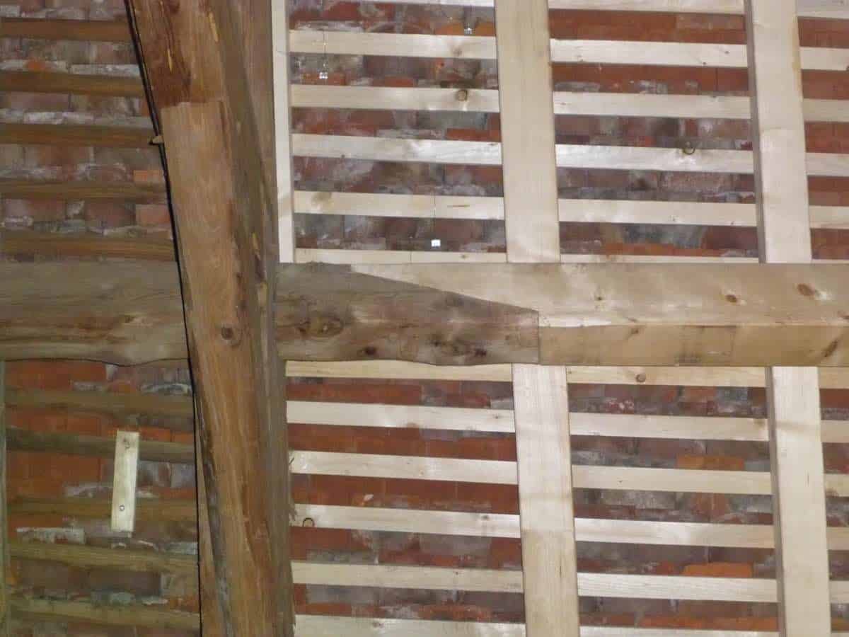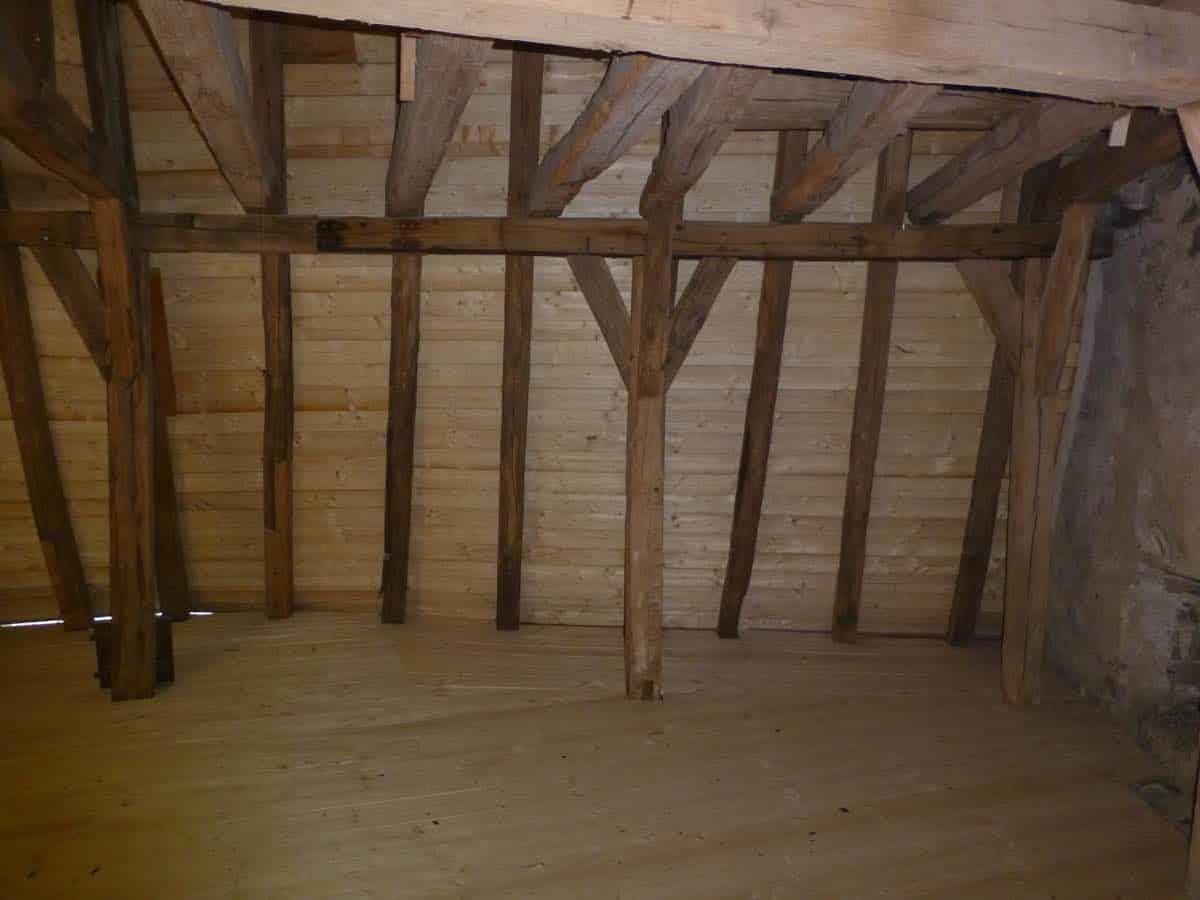 Die bestehenden Decken und Bodenaufbauten sind von besonderem denkmalpflegerischen Belang und wurden bei den Sanierungsarbeiten mit Holzweichfaserplatten vor Beschädigungen geschützt. Die Anarbeitung der Holzquerschnitte erfolgte kleinteilig, um die angrenzenden Befunde nicht zu tangieren.