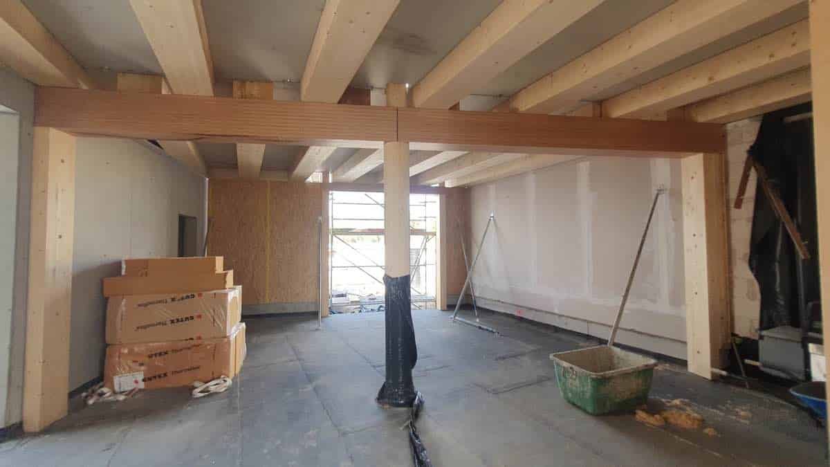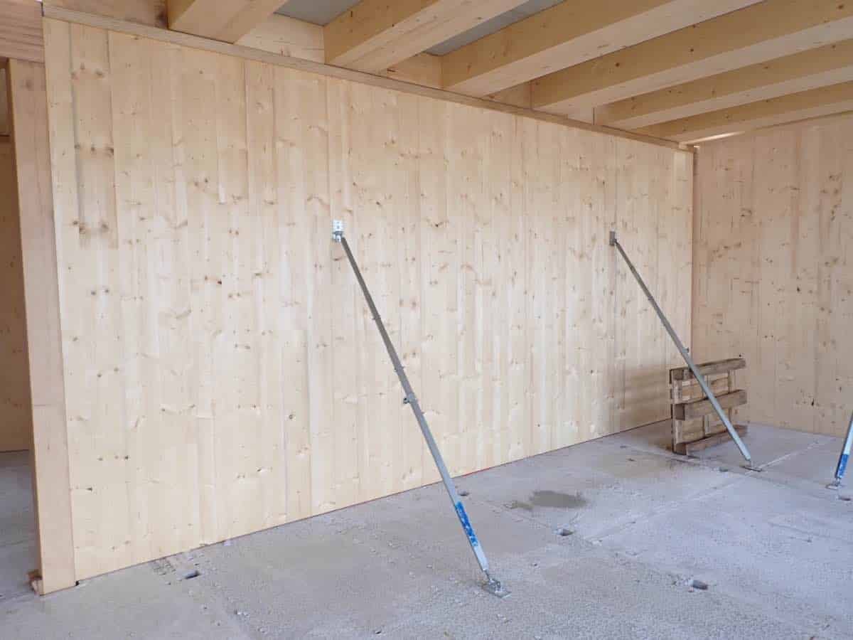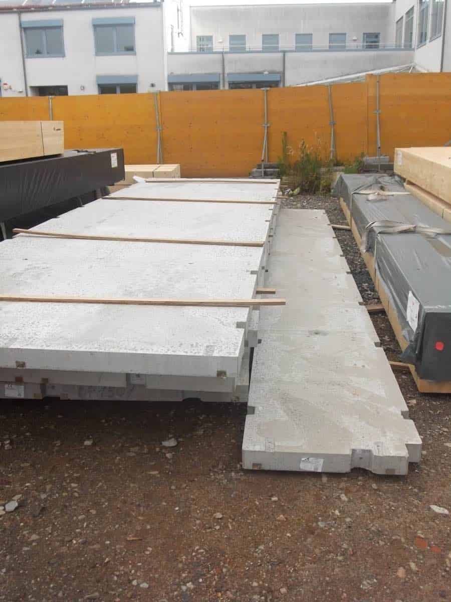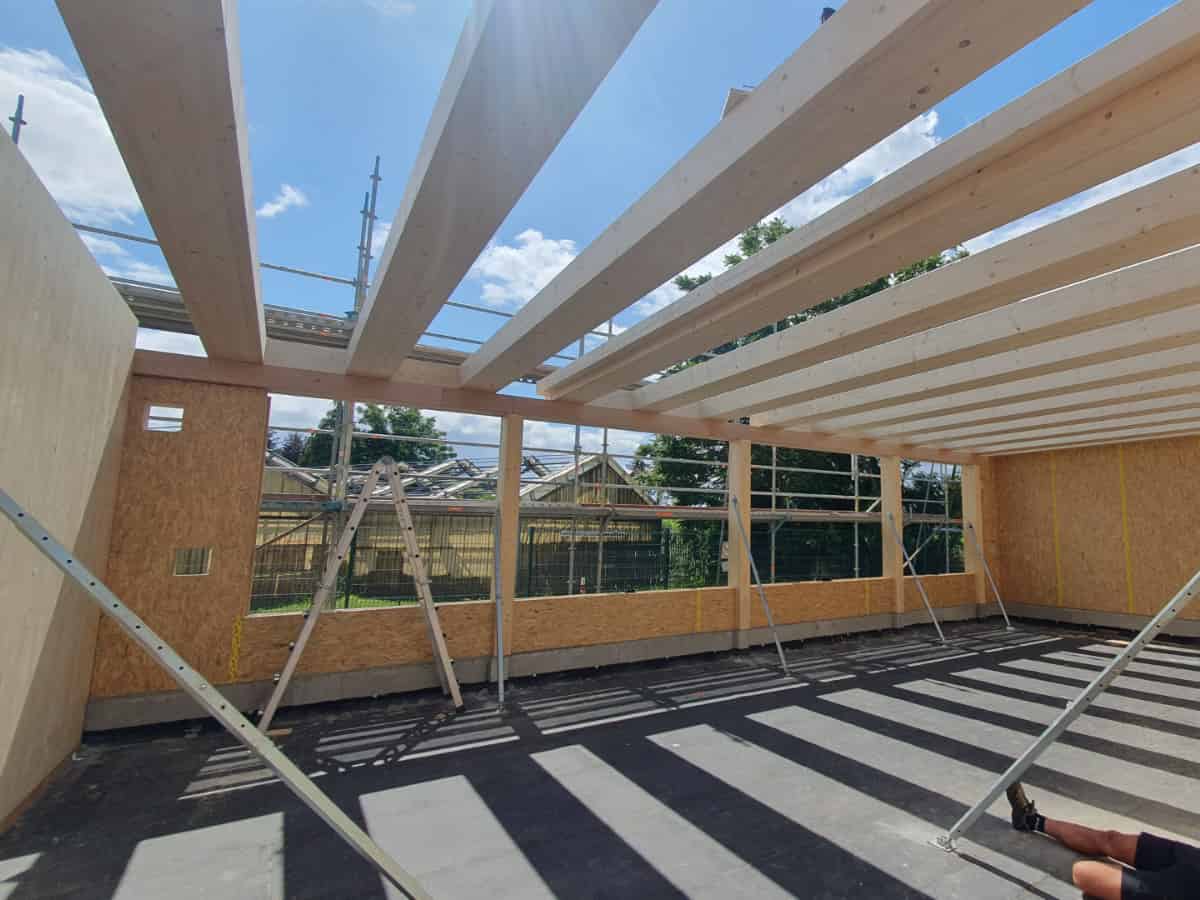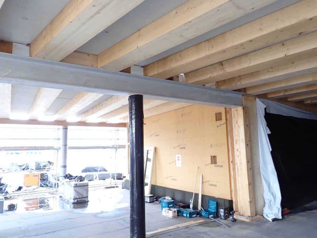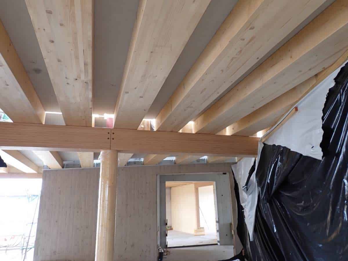 Von uns wurden verschiedene Deckensysteme wie Brettsperrholz-, Brettstapel, Lignotrend und HBV-Decken untersucht. Die Decken sind als HBV-Decken mit Balkenträgern und Bau-Buche Unterzügen gerechnet, da diese ein sehr gutes Schwingverhalten aufweisen und die Deckenunterseite als Masse für den sommerlichen Wärmeschutz dient.
