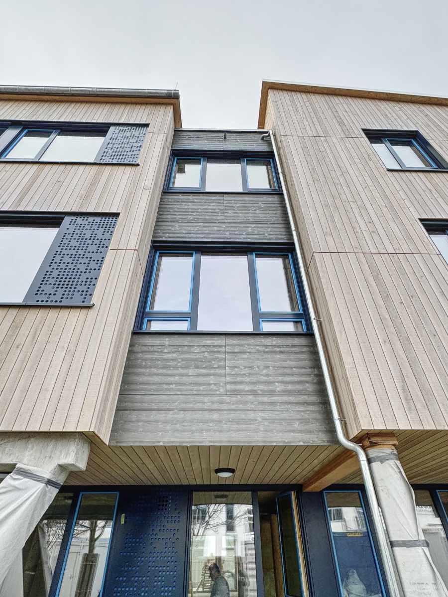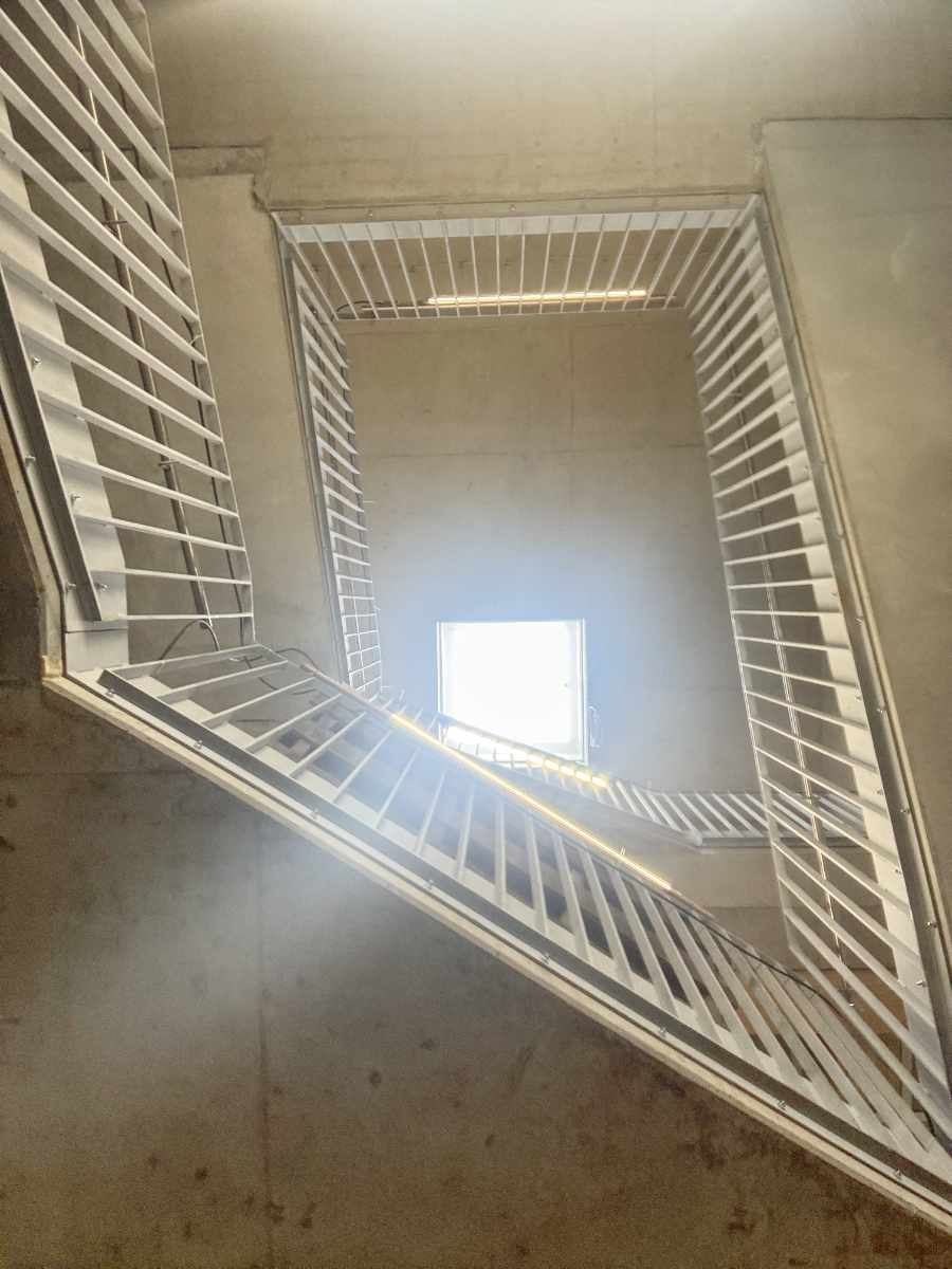 Die beiden Obergeschosse enthalten jeweils zwei Cluster mit vier Klassenräumen für die vier Jahrgänge. Das Erdgeschoss ist zum Pausenhof eingerückt. Hier befindet sich eine Bibliothek, ein Kunstraum und die Kinderbetreuung. Um die Brandschutzanforderungen an den Holzbau möglichst gering zu halten, wird das Gebäude für die Gebäudeklasse 3 geplant. Daher sind die Decken möglichst schlank auszulegen und es besteht keine Höhe für eine flächig abgehängte Decke. Die Unterzüge im Bereich der Fenster sollen mit der UK Decke möglichst abschließen um eine gute Belichtung der Räume zu ermöglichen.
